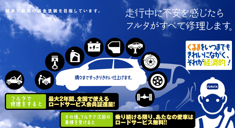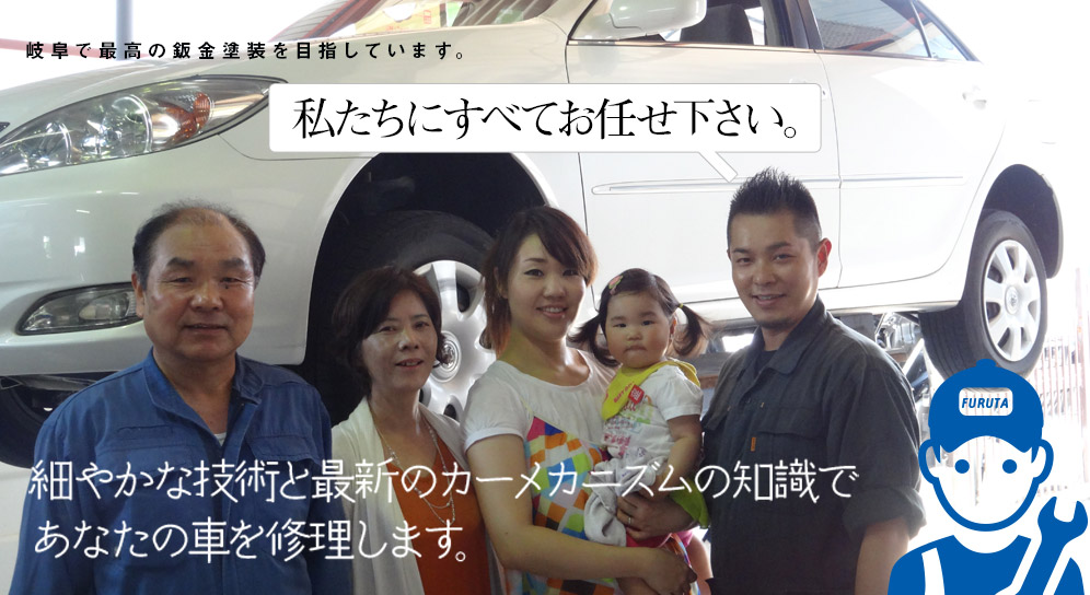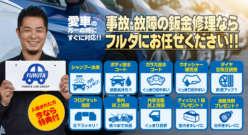 フルタ自動車板金はそれぞれのお客様にご満足をご提供するために修理金額・仕上がり・納期、あらゆるご要望にお答えします。ディーラー・他工場と、どうぞ比べてください。