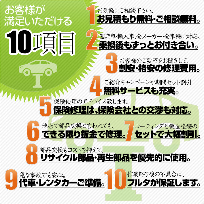 板金塗装修理の工場選びはいろいろな要素を元に判断をしなければなりません。個々の工場を比較することが難しいと思います。フルタ自動車鈑金では、個々のお客様にあったサービスを提供していますが、自動車の板金塗装修理へのお客様の考えは様々です。そこでわたしたちはそれぞれのお客様にご満足いただけるように10項目を設定して対応しております。